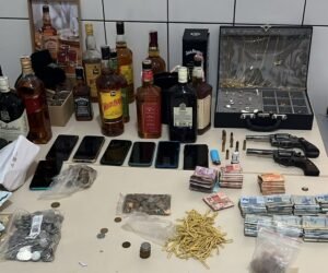 As guarnições iniciaram o acompanhamento e conseguiram abordar o veículo. Durante a revista pessoal e no automóvel, os militares encontraram uma faca, dois revólveres calibre 38, dez munições de mesmo calibre, R$ 4.253,00 em espécie, 25 dólares, 53 joias de diferentes tipos, uma placa de ouro de sete gramas, sete celulares, uma touca balaclava e um boné, além de 14 garrafas de uísque.